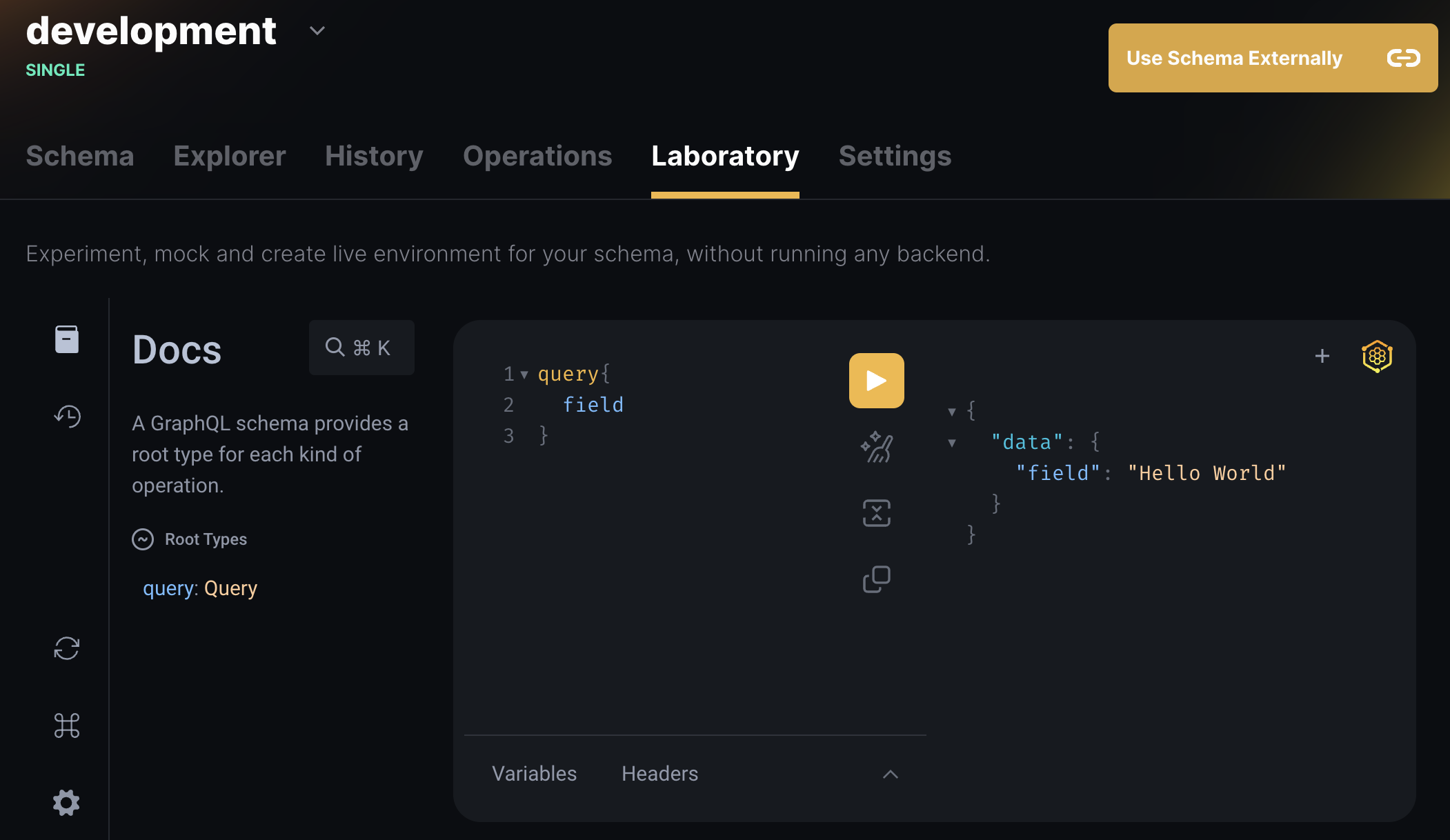 Under your target page, you'll find the Laboratory page. The Laboratory allows you to explore your GraphQL schema and run queries against a mocked version of your GraphQL service.